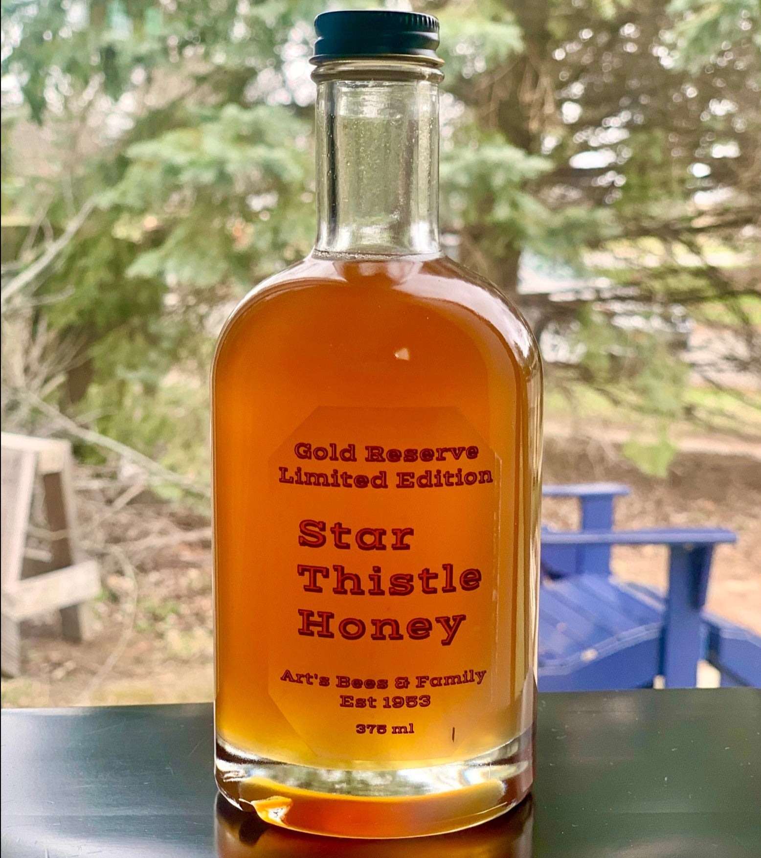 Expertly harvested from Michigan wildflowers, our Gold Reserve Star Thistle Honey delivers a naturally sweet taste with every spoonful. Straight from the beehive to your table, it's a delicious and all-natural addition to your pantry. Savor the pure flavor and potential health benefits with every drop! Sold in a pack of four 12.7 oz / 375mL bottles.